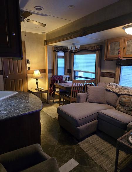 It can sleep up to 6 people with the pull out couch & conversion dinette. Electric heated fireplace, 2 lounger chairs, beautiful kitchen with gas stove & oven, double sinks, microwave, pantry & full fridge, central heat & air. Plus an older but running golf cart....all for $99,000.